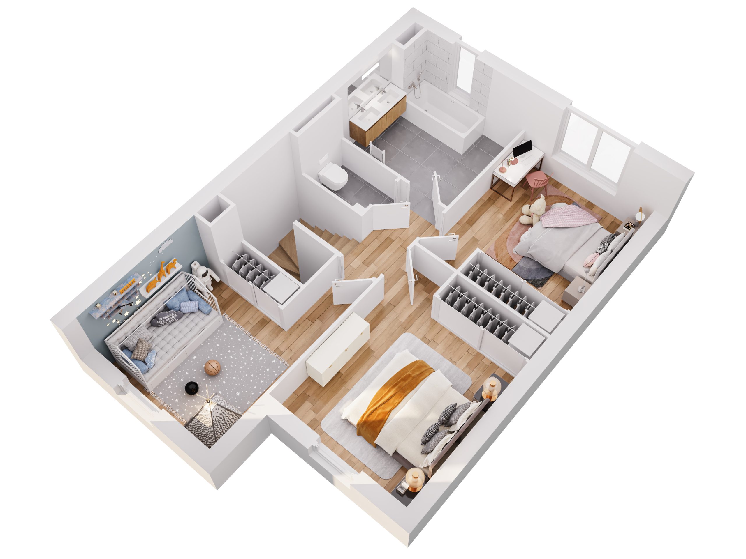 A l’étage se trouve l’espace nuit avec trois chambres, une deuxième salle de bain avec W.C séparés.