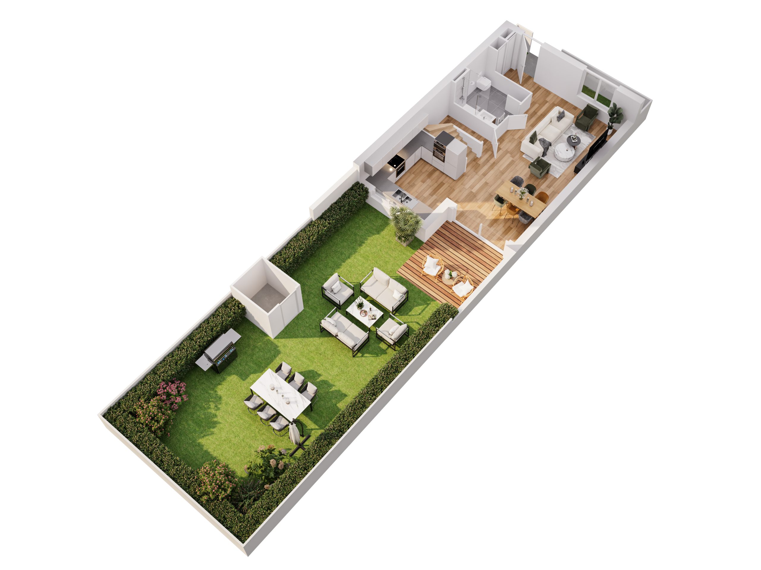 Au Rez-de-chaussée, vous trouverez une cuisine ouverte sur une pièce de vie spacieuse, une salle de bain avec W.C séparés.
